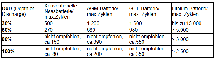 Die angegebenen Zyklen können individuell auf unterschiedliche Nutzungsprofile und Zeiträume bezogen werden. Es wäre nicht sachgerecht, allein von einer Lebensdauer in Jahren zu sprechen, da dies irreführend sein könnte. In unserem Fall entspricht ein Zyklus (Teilzyklus, nicht Vollzyklus) einer Teilentladung der Batterie auf 50 % Restkapazität (DoD), gefolgt von einer vollständigen Aufladung auf 100 % Ladezustand.