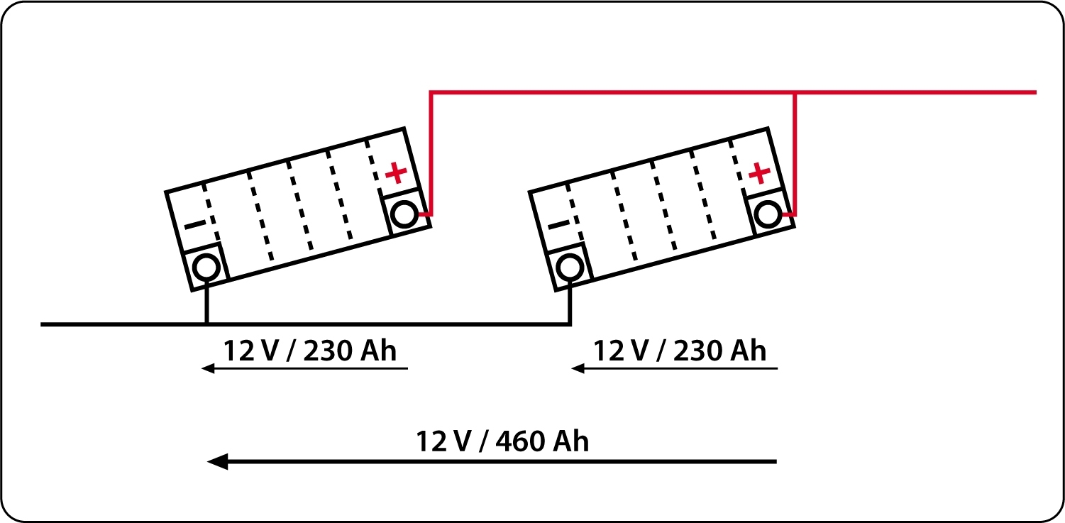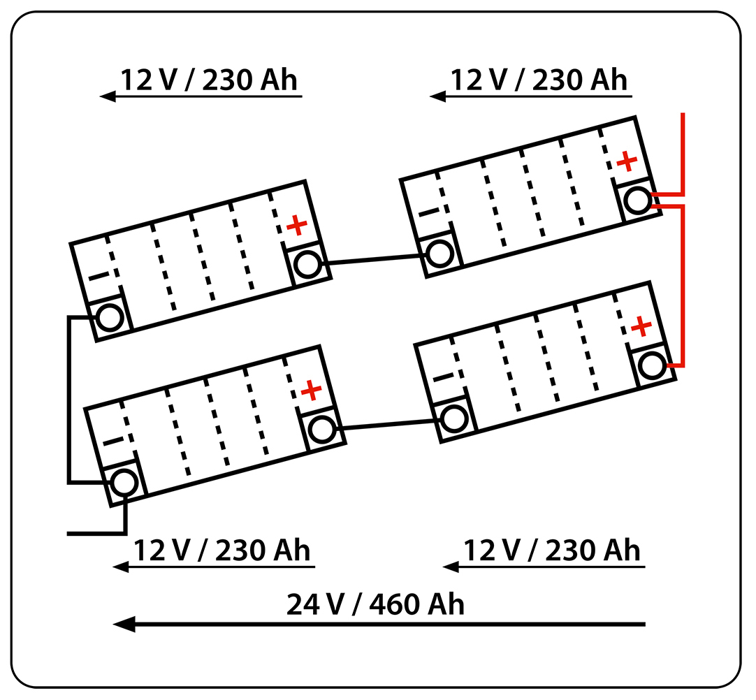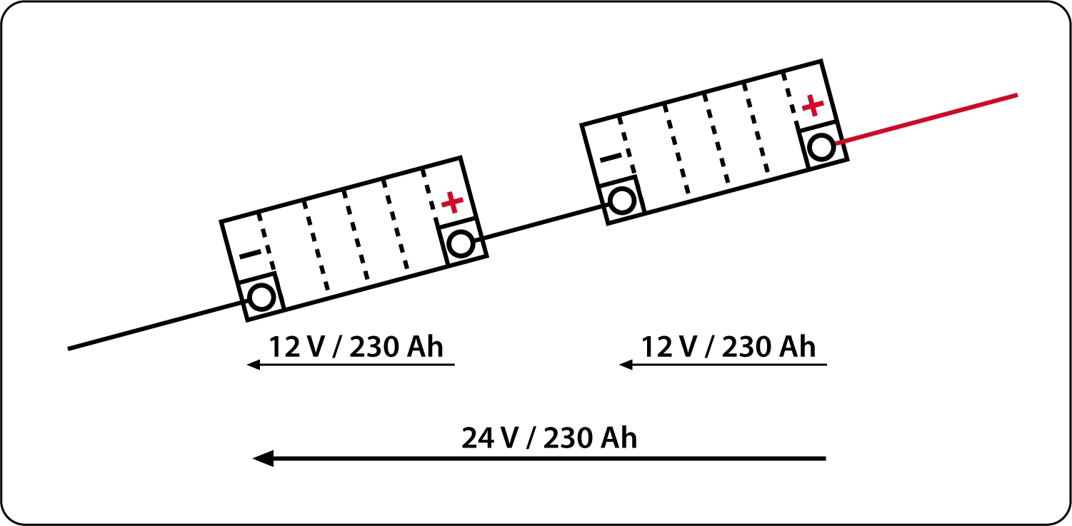 Zwei Batterien werden in Serie geschaltet → 24 V / 100 Ah
